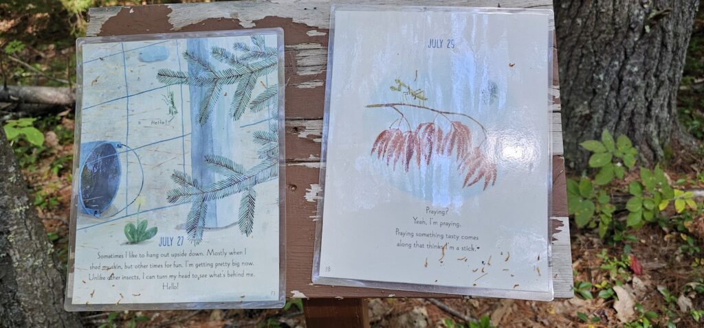 Adjacent to the labrynth is a flat 2.7 mile loop trail, flat and easy.  It is actually a “story walk.” Along the trail are pages of a children’s story about the life cycle of the Praying Mantis. I had no idea these insects were so predatory. But then, is there such a thing as just a little killer instinct? Apparently, praying mantis ambush and consume other insects, spiders, and even small vertebrates like frogs and hummingbirds.